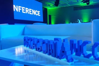 En la entrada de una fiesta, invitando a todos los participantes a terminar de construir el logo.